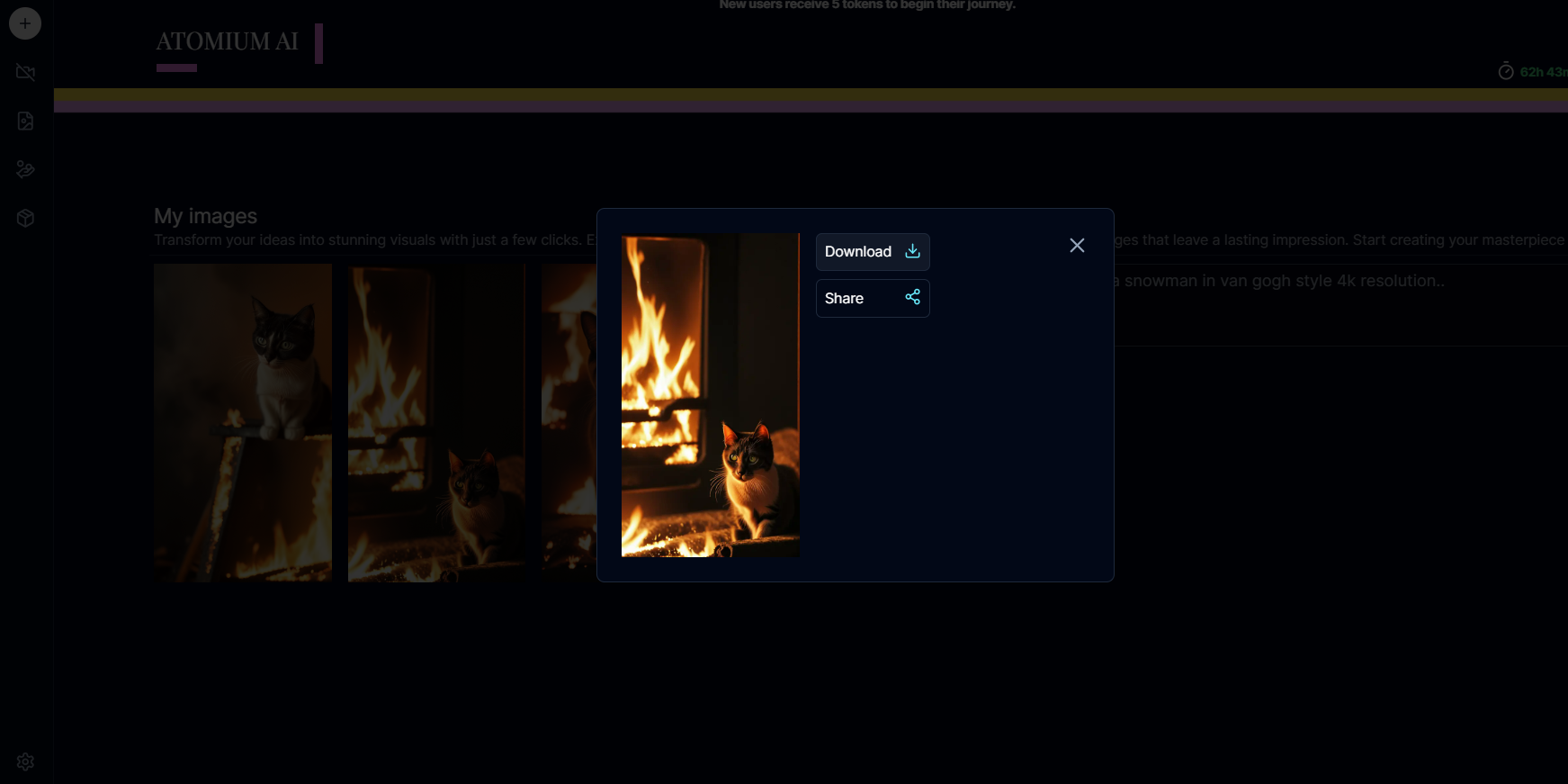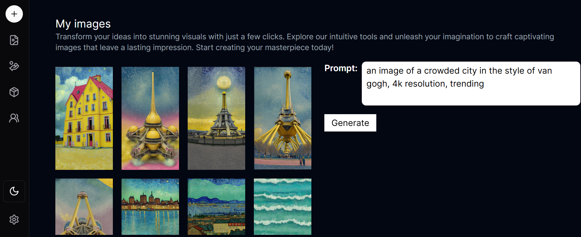 With our AI-powered tool, users can easily generate high-quality images tailored to their needs. These images are produced using sophisticated algorithms that ensure unique and visually appealing results every time. Once generated, the images are automatically added to the user's personal collection, making it easy to manage and access them whenever needed. Whether you're looking for creative inspiration, visual content for a project, or simply exploring the possibilities of AI-generated art, our tool provides an intuitive and efficient solution.